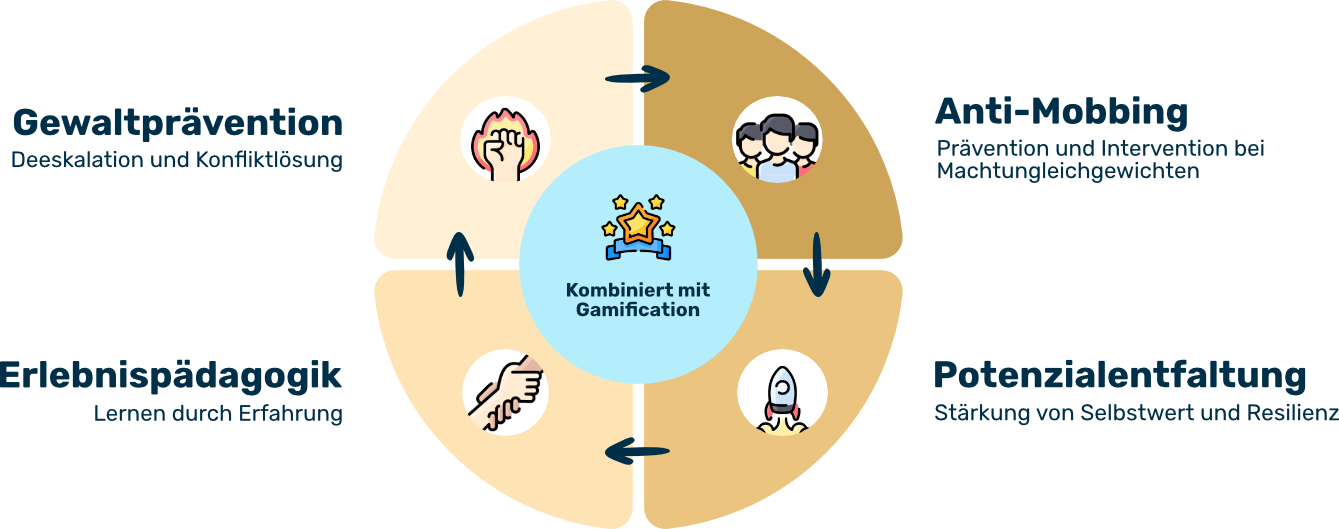 Durch erlebnispädagogische Methoden und Gamification machen wir die Klassenrealität sichtbar. Die Jugendlichen reflektieren ihr Verhalten und entwickeln emotionale Verbundenheit sowie intrinsische Veränderungsbereitschaft.
